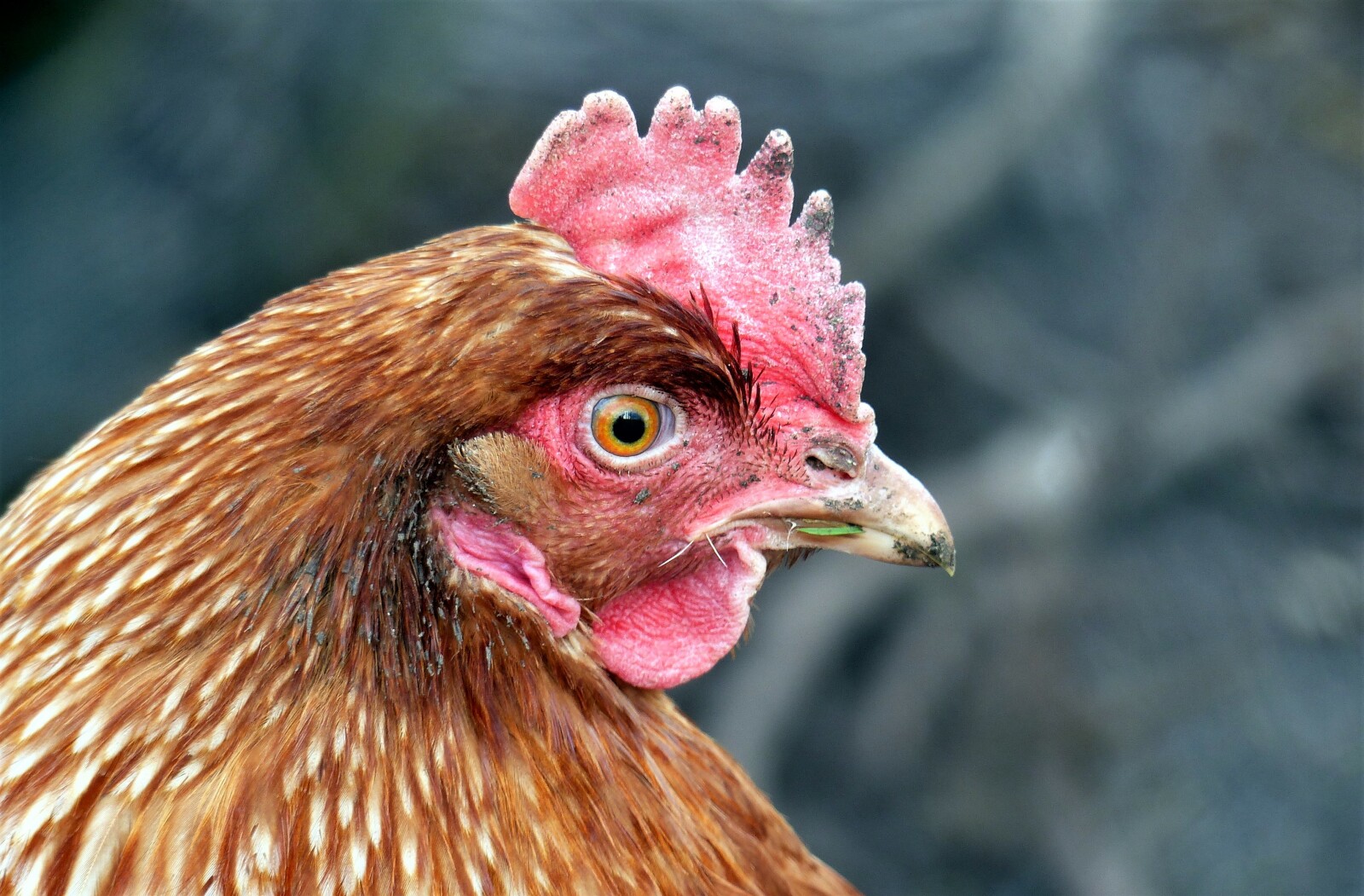 Man skal være hurtig, når man fotograferer høns. De farer frem og tilbage, og når de endelig står stille, virrer hovederne fra side til side, som var de til bordtenniskamp. Men endelig fik jeg gennem trådhegnet om hønsegården sat fokus på dette eksemplar af racen Isa Brown, også kendt som "Rød amerikaner". Det er ikke en suppehøne, men denne farverige dame lægger snildt op til 300 æg om året!