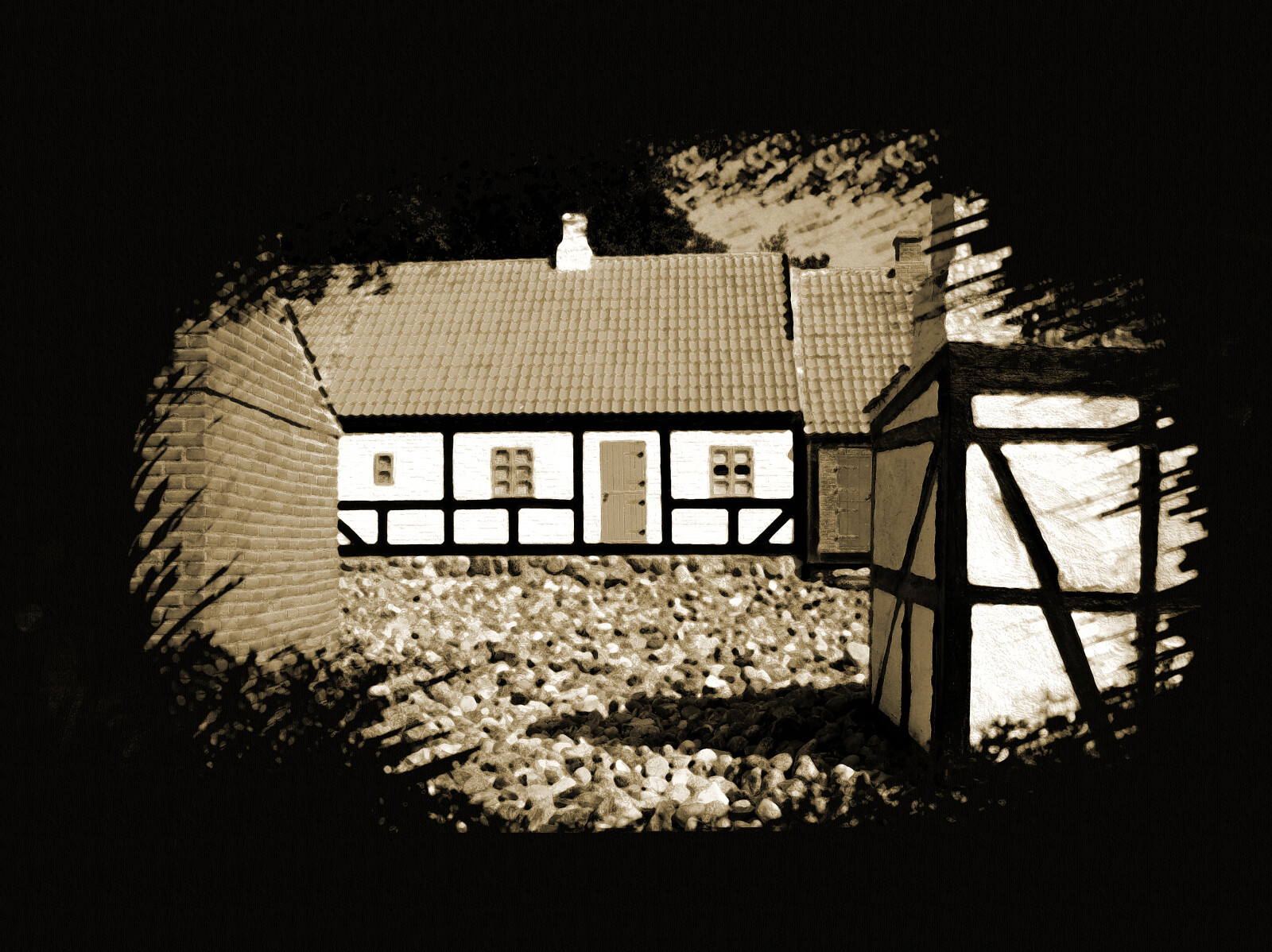 Jeg har forsøgt at lave et "gammelt" billede af et hus, set gennem en busk