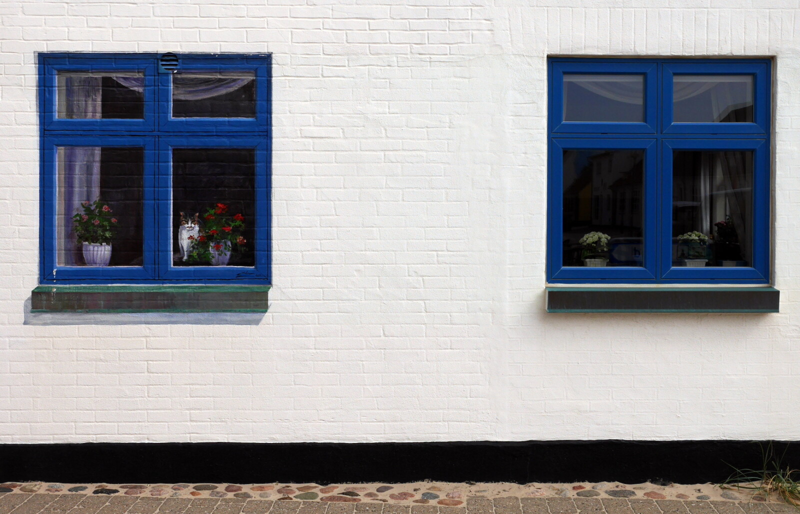 Inspireret af Claus Hansens fine foto fra Ærø af "Æ' faul i æ' vinne har jeg fanget et andet kræ i vindueskarmen. Det er lige så lidt i live som fuglen, da den opmærksomme hurtigt vil opdage, at vinduet og hele molevitten er malet på facaden. Motiv fra badebyen Løkken.