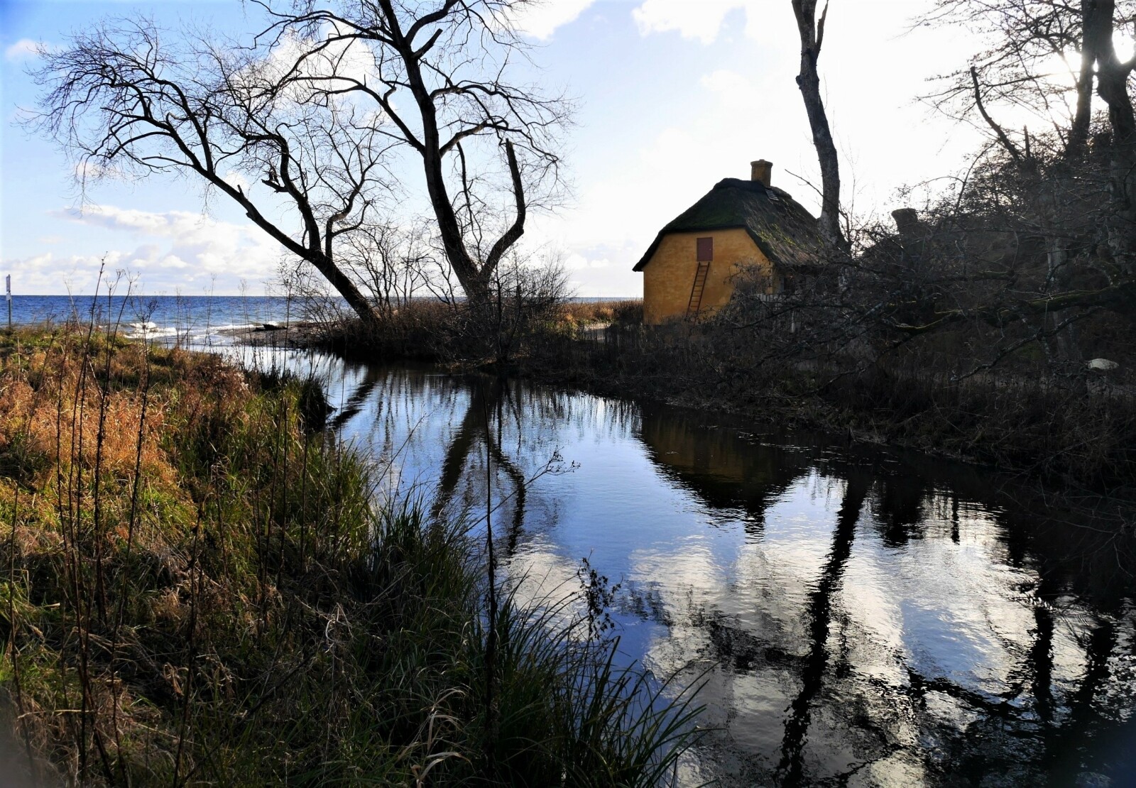 Giber å løber ud i Aarhusbugten ved Moesgaard Strand syd for Aarhus. Til højre ses Fiskerhuset, bygget i 1856. Fiskeren var i gamle dage ansat på Moesgaard Gods og måtte aflevere hovedparten af sin fangst til herskabet.