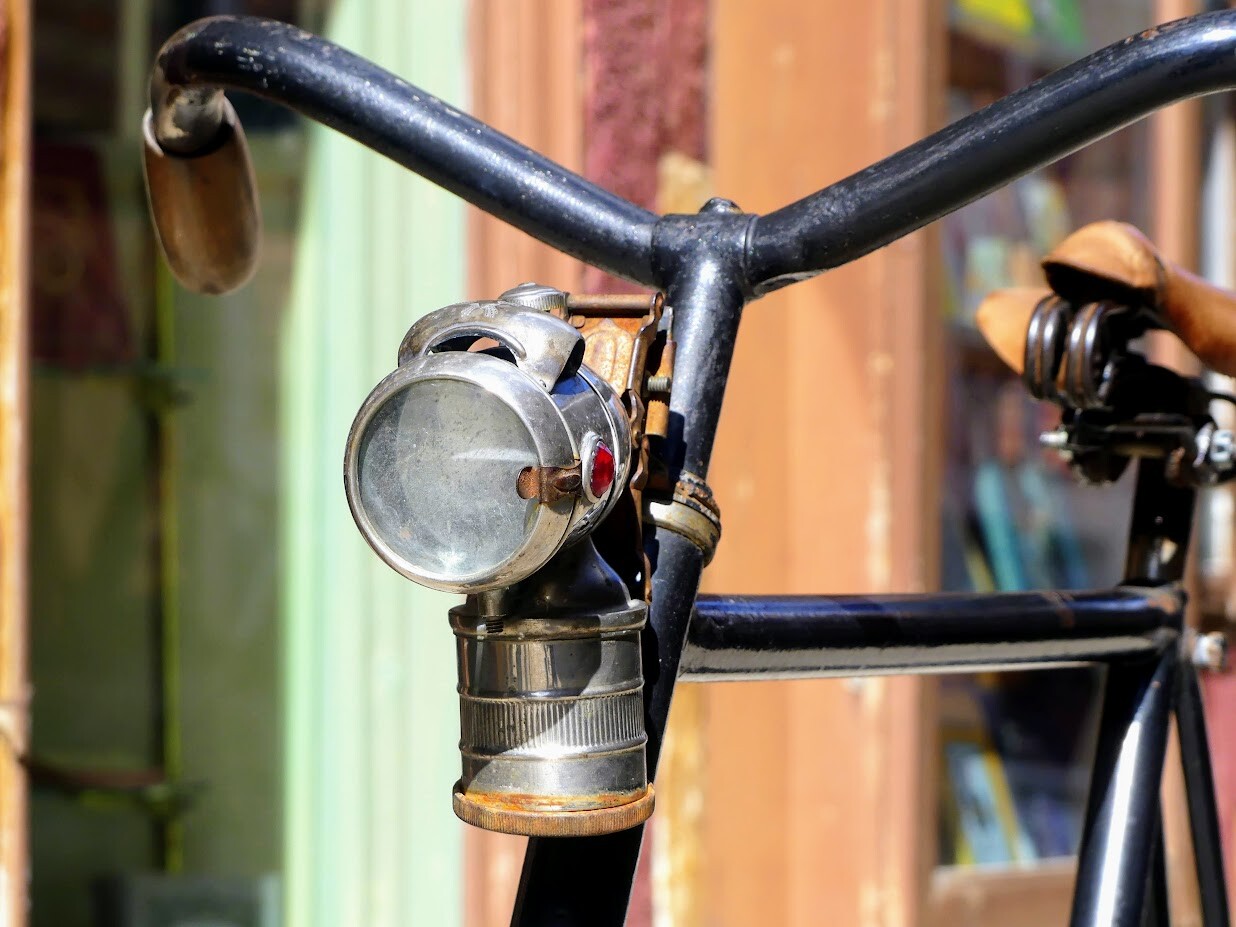 Gammel karbid-cykellygte, formentlig 1940'erne. Man tilsatte vand til karbid-beholderen, det udviklede gasarten acetyl - den blev antændt med en tændstik, og man havde et kraftigt lys.Når vandet slap op en mørk aften, var der nogle, der fandt på råd: De tissede i beholderen, det gav ny gas og lys i lygten.