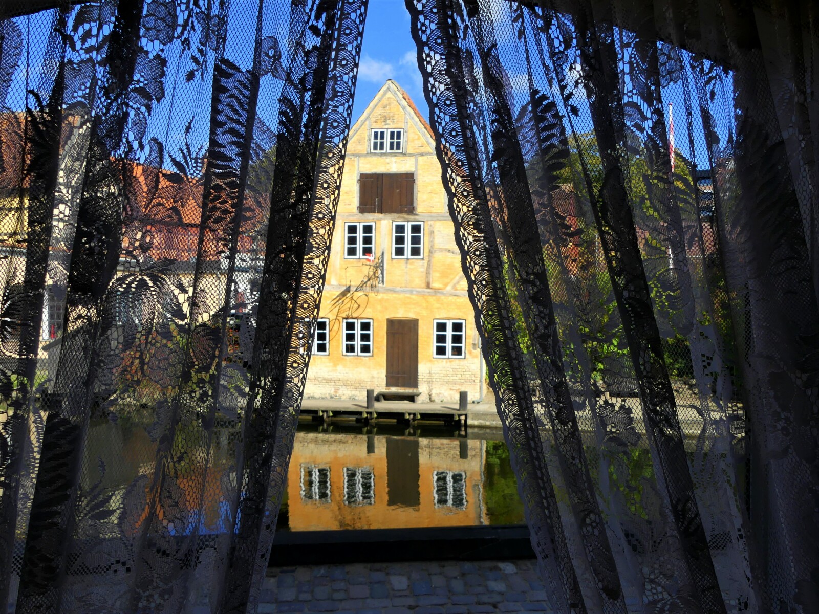 Bag dette gardin kan man holde øje med livets gang i Lidenlund - i dette tilfælde Den Gamle By i Aarhus.