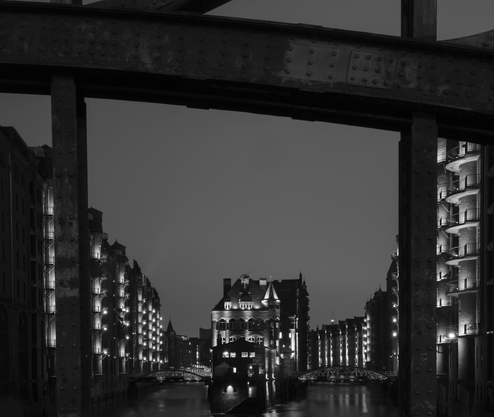 jeg har prøvet at give billede en ramme ved hjælpe af broen vi stod på og så i sort/hvid da der var lilla lys i vinduerne den aften