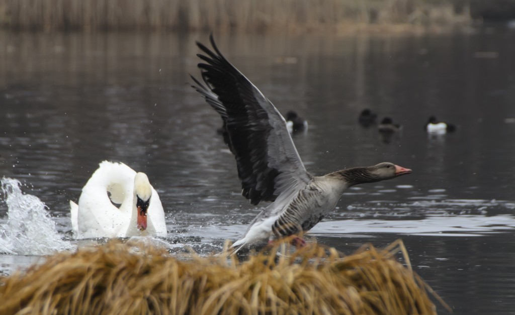 Grågås flugt fra svane
