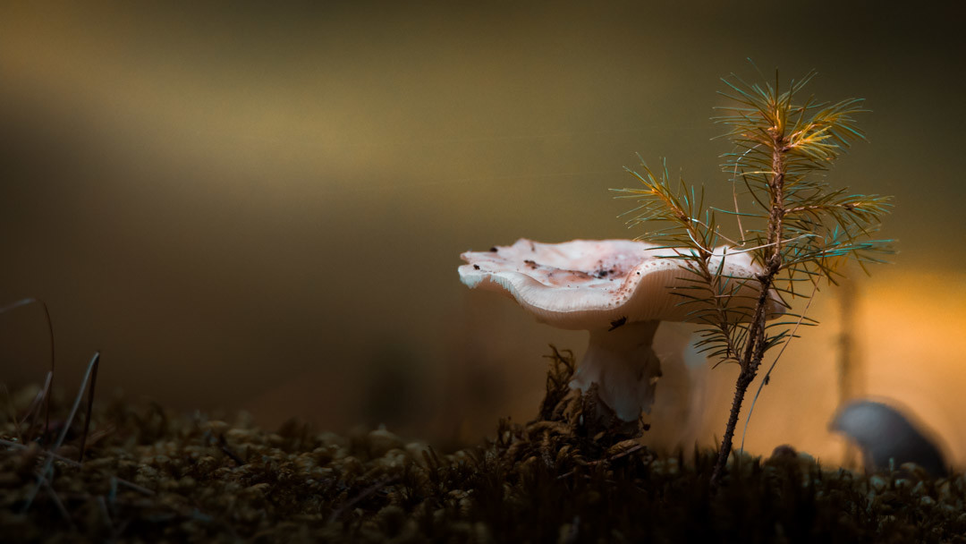 Det var sidst på eftermiddagen da jeg tog i skoven for at finde de store hjorte i deres brunst. Vandrede med stille skridt et godt stykke ind gennem nåleskoven. Elsker den stilhed der er i nåleskovene, med et tykt lag lækker grøn mos og duftene fra nåletræerne der fylder kroppen ved ethvert åndedrag. Da vekslerne kom hyppigere fandt jeg mig et lille sted ved et træ med god overblik. Her lå jeg og ventede og ventede. Da himlen åbnede sig og lukkede noget lys ind stod svampen som var det den der ventede på mig og på at blive foreviget inden den ender på panden, med en masse andet godt fra skovens gavmilde kammer.