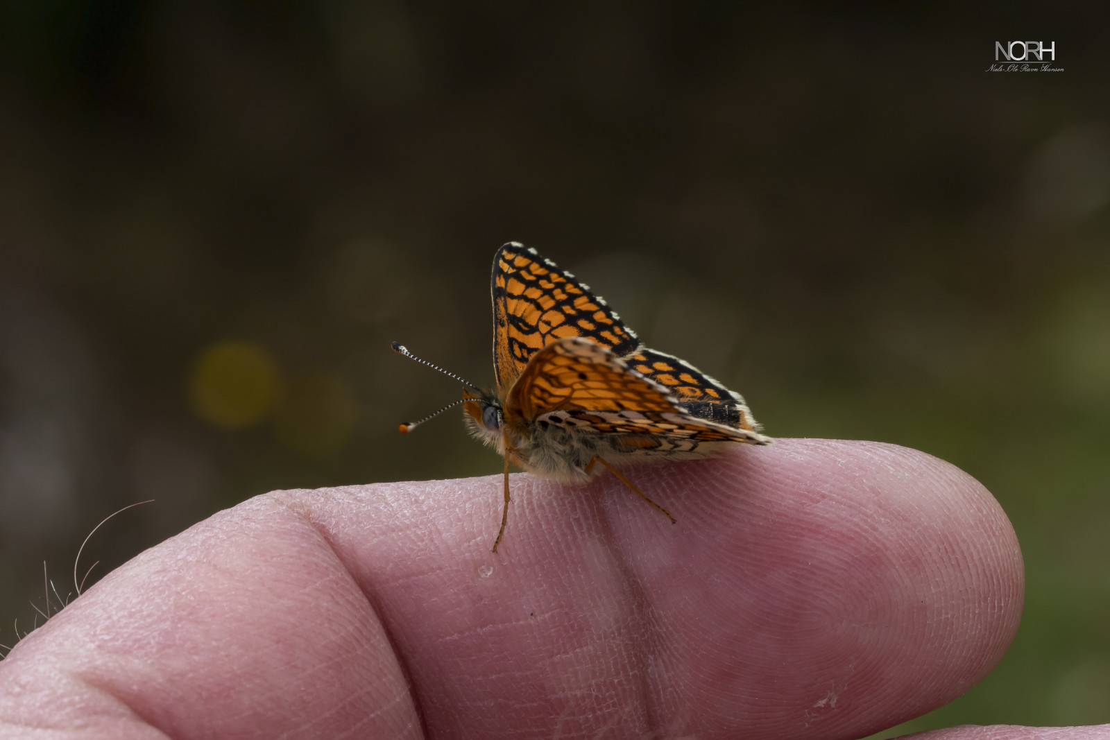 Tillid imellem mennesker og dyr i naturen, kan sagtens lade sig gøre. Her ses som omtalt ved et tidligere billede, Okkergul Pletvinge der frygtløs sidder på min finger.